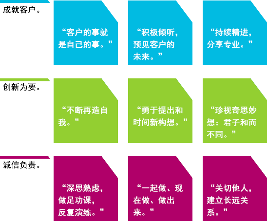 - 成就客户:聚客人满怀热情地与客户建立稳固、长远的关系,这激励着我们超越客户的期望。我们专注于结果——按照每一位客户衡量成功的标准,帮助他们取得成功。
